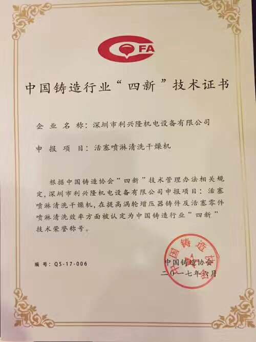 利兴隆机电从100多家铸造行业同行申报竞争中脱颖而出,获得中国铸造行业“四新”技术证书,全国只有10家企业获得此殊荣,在此感谢行业的认可,辛苦利兴隆人的努力付出!在未来,利兴隆会继续保持不断地技术创新,和不断进取的信念,本着“以人为本、技术创新、诚信服务”的经营理念,用最好的产品,为广大用户制造出最好的,最专业的清洗设备!